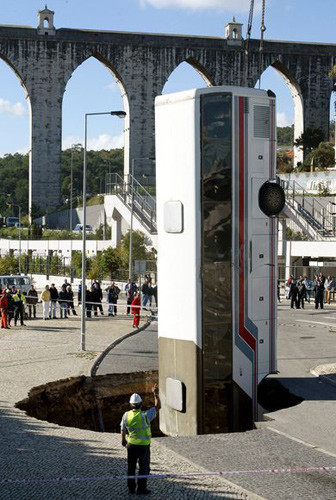 2003年拍摄于葡萄牙里斯本,一辆不幸的巴士成为街道上一个大陷坑的“午餐”。密苏里州的格乌泽表示,能够导致水流入地下土壤的任何因素都能加速陷坑形成。在很多城市,下水道、光缆等公共基础设施埋入填满松散料的沟槽内,这些充填料会随时间推移被最终冲走。在某些情况下,一段路面会最终变成一个下方基本上空空如也的混凝土桥。格乌泽说:“此时的路面无法承受上方驶过卡车的重量。”